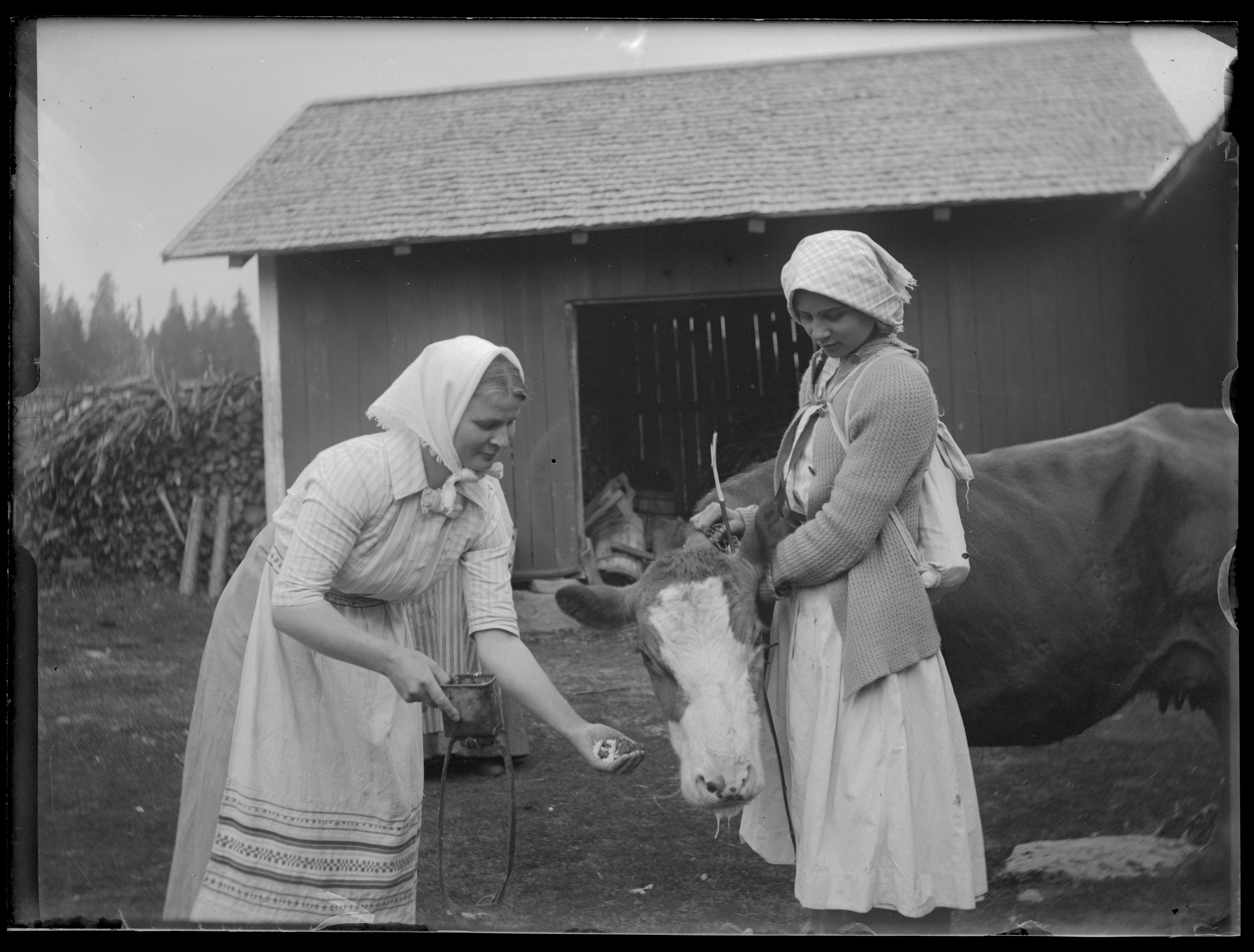 As often is the case with folk magic, there is some variation in this practice. In the archives of The Society of Swedish Literature in Finland (SLS) one can find a staged photo of two young women feeding salt from a cowbell to a cow. The legend to this image explains that this was done so that the cattle will keep together at the pastures. Thus, the idea to keep the herd together is present here too, but the salt is not poured through the loop in the bell’s tab nor put into water. The picture is taken in 1914 in a Swedish-speaking village in Porvoo. Therefore, this type of cattle magic was known both to Swedish-speaking and Finnish-speaking people in the area of nowadays Finland.